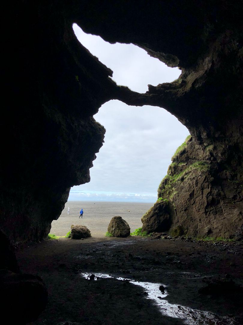 Вид от пещеры на запад довольно мрачный. Безжизненное черное лавовое поле. Вдали видны скалы Рейнисдрангар.